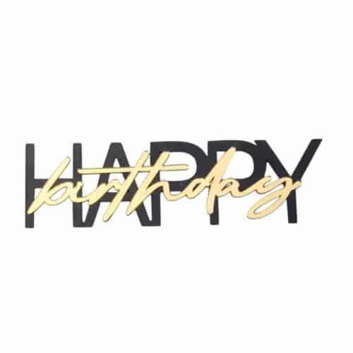 Mooie taartdecoratie met de tekst Happy Birthday in zwart acryl met een opplak tekst in acryl goud. Deze tekst kan je op een taart leggen of tegen een taart aanplakken. Deze heeft geen prikker. Leuk voor op een Bento taartje.