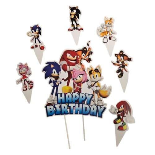 Leuke taarttopper van Sonic van stevig mooi gekleurd papier met 12 bijpassende cupcake prikkers. Maak van jouw taart in een handomdraai een Sonic taart!