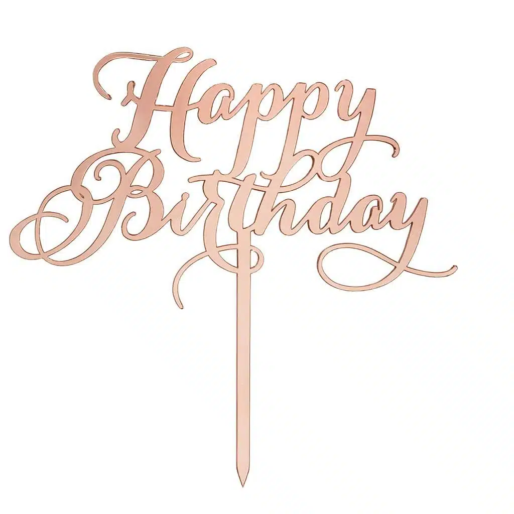 Sierlijke Happy Birthday topper van roze glanzend acryl met sierlijke letters.