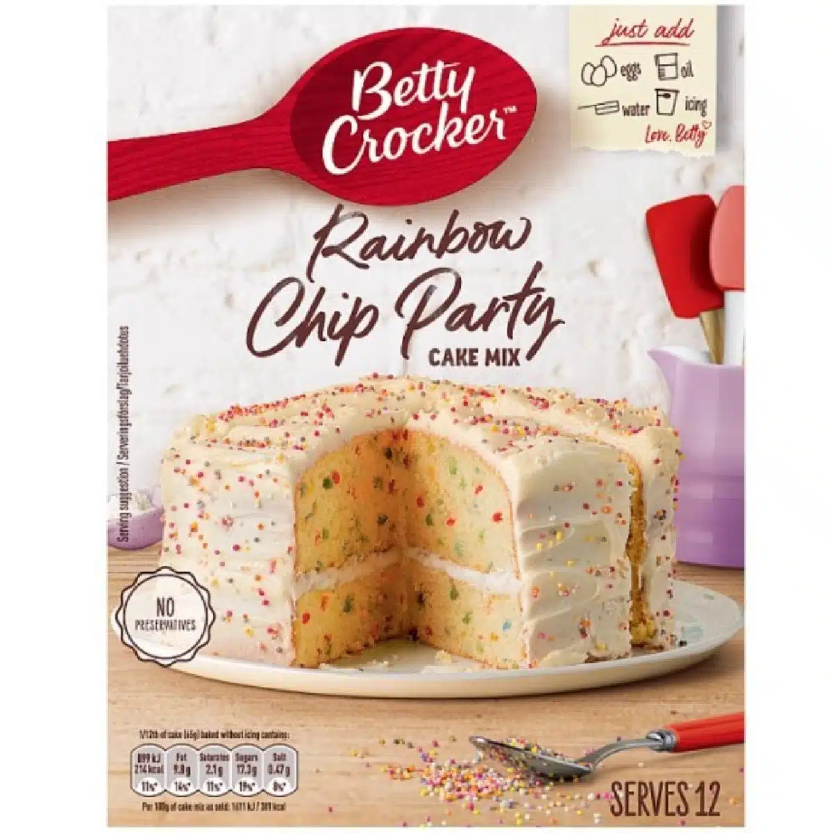 Met de Betty Crocker Rainbow Chip Cake Mix van 425 g bak je een vrolijke, vanillecake vol kleurrijke chips die tijdens het bakken smelten. Voeg simpelweg eieren, olie en water toe aan de mix, roer het beslag glad en bak het in de oven voor een luchtige en feestelijke cake.