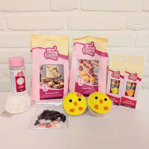 Met dit pakket maak je van de 500 gram mix maar liefst 22 – 24 mooie cupcakes. Bak de cupcakes voor een mooi resultaat in een cupcake bakvorm. Maak de Botercrème volgens de aanwijzing op de verpakking. Kleur een klein deel van de icing oranje en de rest geel. Doe de oranje crème in een spuitzak en knip een klein puntje van de zak af. Smeer met een spatel of broodmes een laagje gele crème op het cakeje. Dip het cakeje in de suikerkristallen voor een egaal laagje. Decoreer met de suikerparel, bloemen en oranje creme en maak er schattige kuikens van.