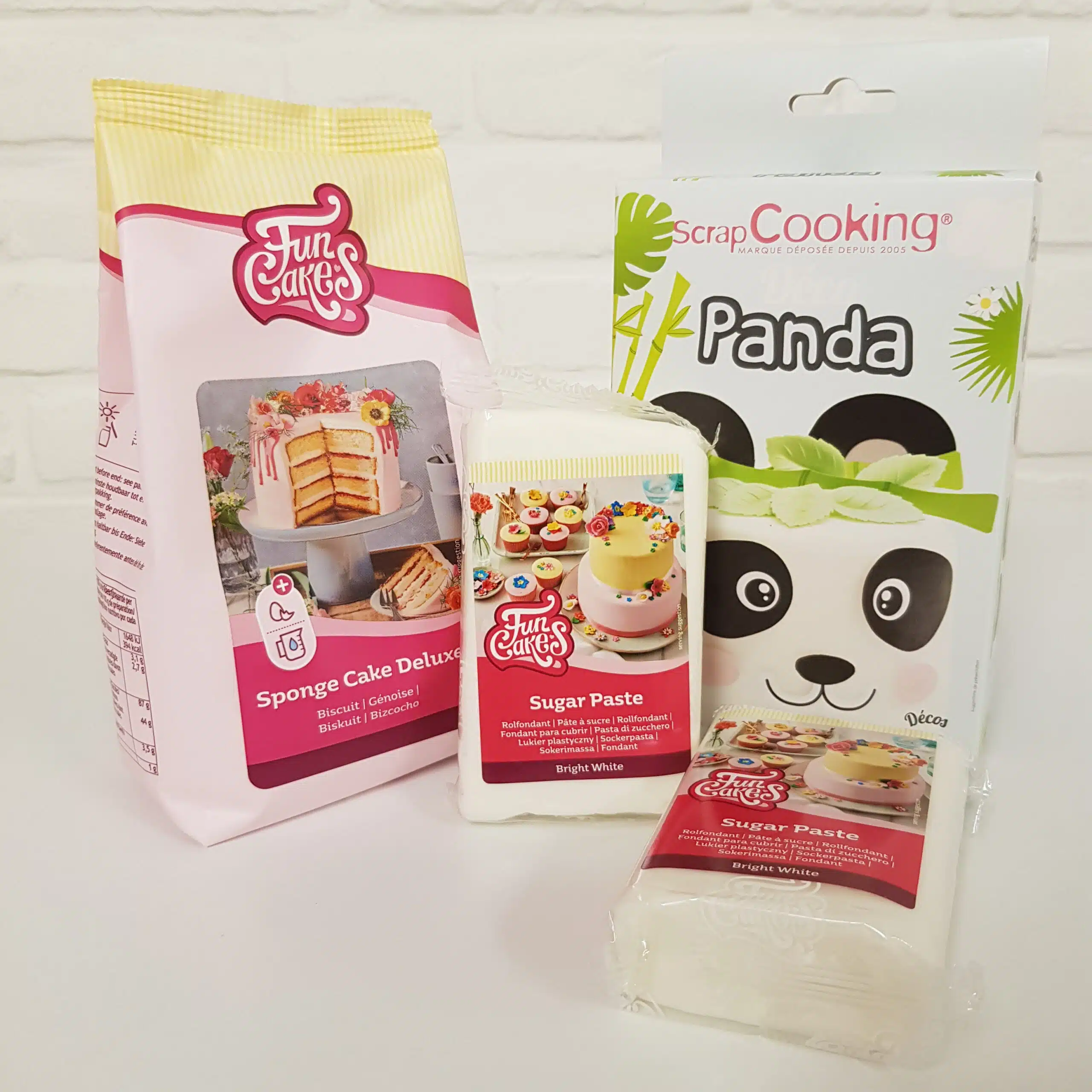 Kies een bakvorm naar keuze. Bij voorkeur een ronde bakvorm met een doorsnede van 15 – 20 cm. Kijk op de achterzijde van de verpakking hoeveel mix, eieren en water je moet nemen voor de grote van jouw bakvorm. Hier vind je de benodigdhedentabel:https://funcakes.com/nl/benodigdhedentabel/. Mix de ingrediënten volgens de gebruiksaanwijzing op de verpakking. Spuit de bakvorm goed in en zet de biscuit in de oven. Voor de vulling kan je kiezen voor jam, botercrème etc. Je moet de taart afsmeren voordat je deze kan bekleden met de fondant. Voor het afsmeren gebruik je ca 200 gram ongezouten roomboter mengen met 200 gram poedersuiker. Als je de taart hebt afgesmeerd, ga je de fondant uitrollen voor het bekleden van de taart. De fondant rol je bij voorkeur uit op een grote placemat of plastic tafellaken. Om het plakken van de fondant aan de placemat te voorkomen, kan je gebruik maken van een beetje aardappelzetmeel of maizena, maar gebruik niet te veel! Anders kan het fondant gaan scheuren. Zodra je de taart hebt bekleed, kan je de onderdelen uit de Panda Deco Kit toevoegen. In de kit zitten de kant-en-klare panda onderdelen, zoals de ogen, wangen, oortjes, neusje, en bamboe van ouwel die je direct op een met fondant beklede taart kan plakken. Daarnaast zitten er nog drie mooi gekleurde 3D ouwel blaadjes in om het af te maken. De kit is geschikt voor een taart van ca 15 – 20 cm doorsnede en ca 10 cm hoog. Je plakt de onderdelen op de fondant met een beetje eetbare lijm of maak de fondant voorzichtig een klein beetje vochtig met water. Gebruik geen water op de ouwel, maar alleen op het fondant precies waar je het ouwel onderdeel gaat plakken. Laat als je het water hebt aangebracht, eerst de fondant een klein beetje plakkerig worden en plak dan het ouwel onderdeel op de fondant. Alle onderdelen zijn van dik ouwel papier en volledig eetbaar.