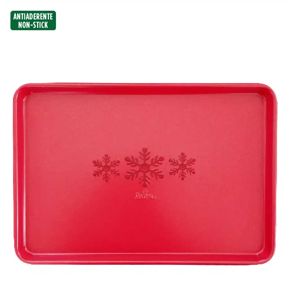 Leuk om in te bakken, maar ook leuk als cadeautje deze rechthoekige bakvorm in mooie kerstrode kleur met een sneeuwvlok print op de bodem.