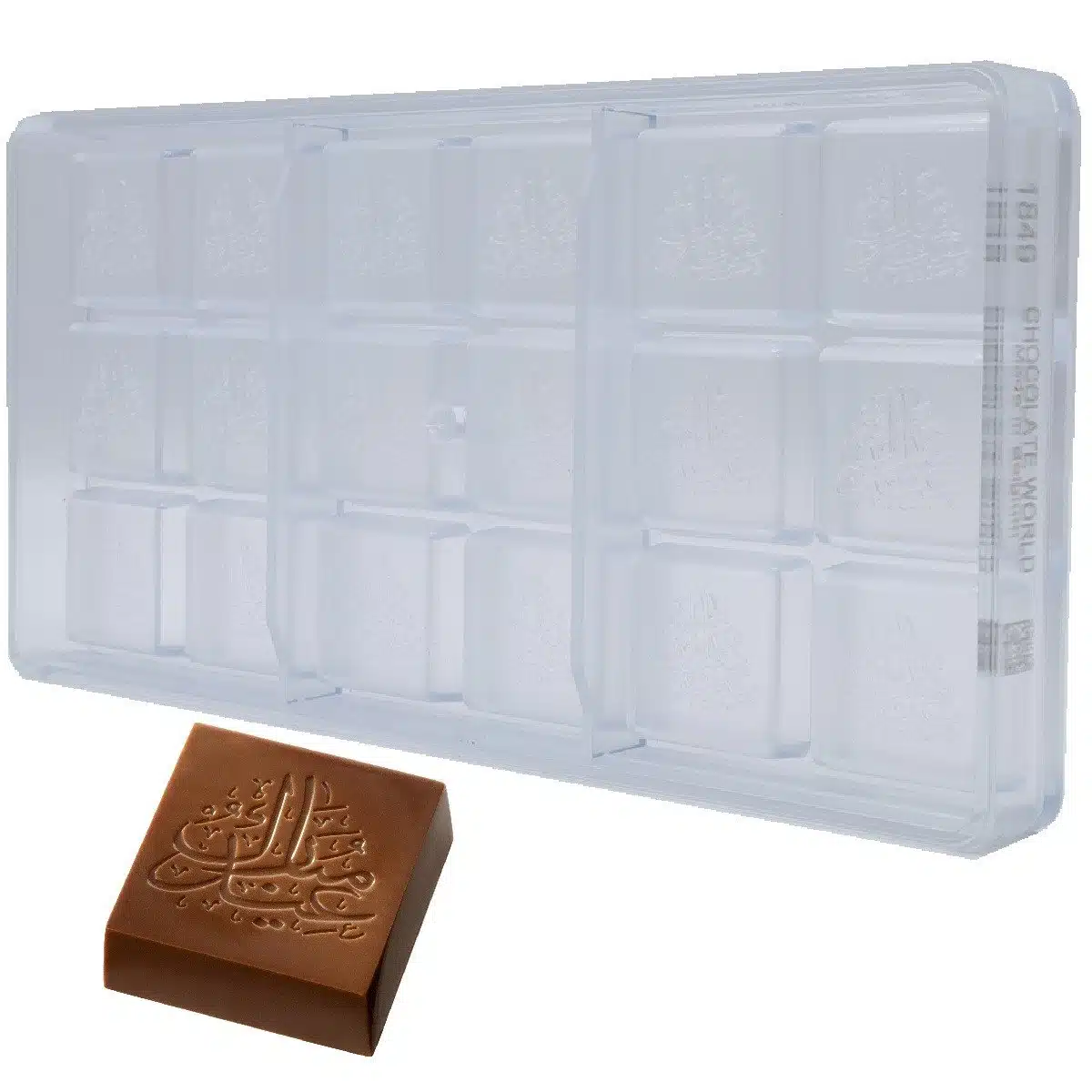 De Bonbonvorm Chocolate World Eid Mubarak (18x) 34x34x11,5mm is een prachtige bonbonvorm waarin je verfijnde en feestelijke bonbons kunt creëren. Deze chocolademal bevat 18 holtes, deze holtes zijn vierkant en hebben een Eid Mubarak opdruk. Elke bonbon heeft een grootte van 3,4 bij 3,4 centimeter en een hoogte van circa 1,1 centimeter.