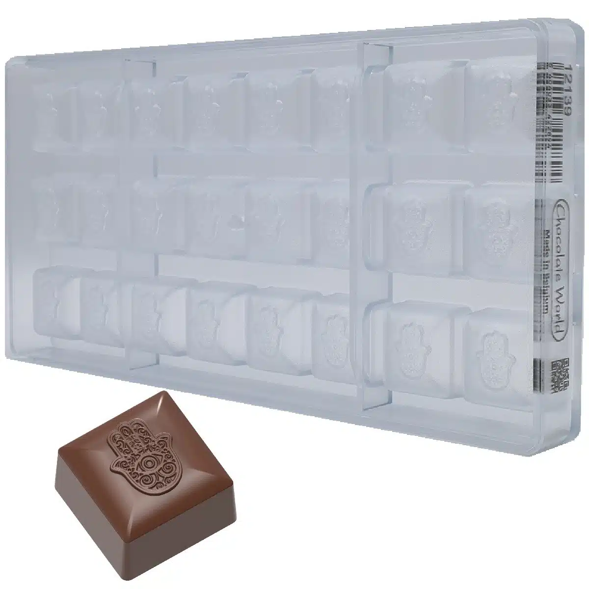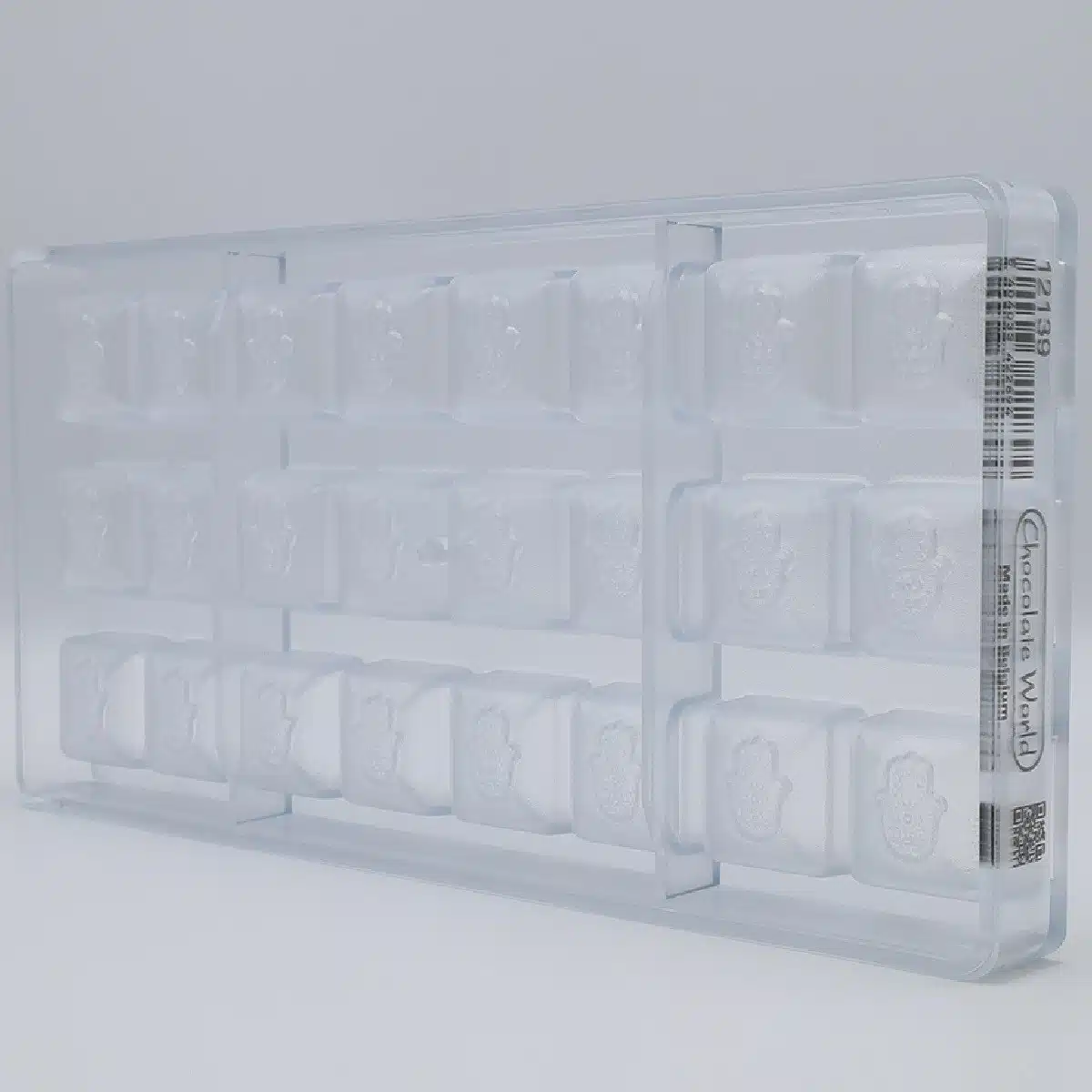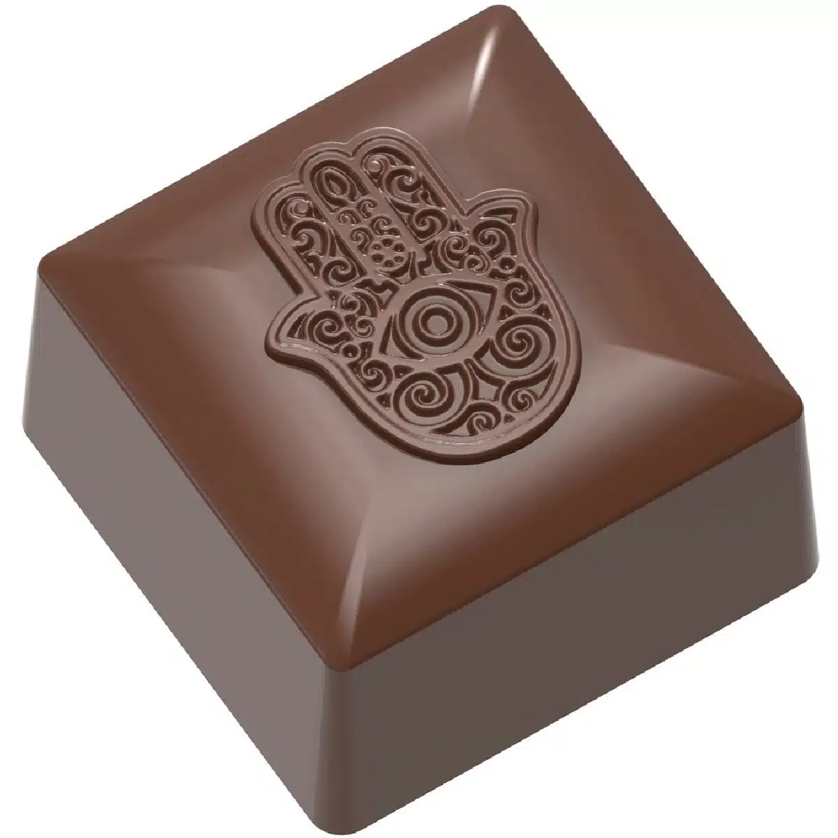 Met de Bonbonvorm Chocolate World Hand van Fatima (24x) 25x25x16mm creëer je prachtige bonbons met een symbolische uitstraling. Deze vierkante chocoladeblokjes zijn gedecoreerd met een gedetailleerde Hand van Fatima. Dit is een symbool van bescherming en geluk. In de bonbonvorm kun je 24 vierkante chocolaatjes creëren met een afmeting van 2,5 bij 2,5 centimeter en een hoogte van 1,6 centimeter.
