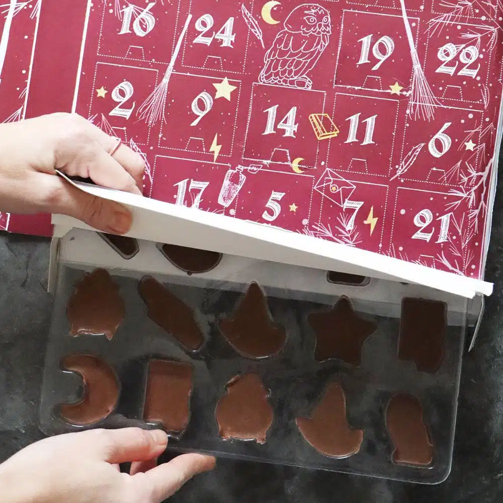 De set bevat alles wat je nodig hebt om je eigen chocolaatjes te maken in betoverende vormen, zoals een heksenhoed, heksenketel, potion boek, bliksemschicht, ster, uil en maan.