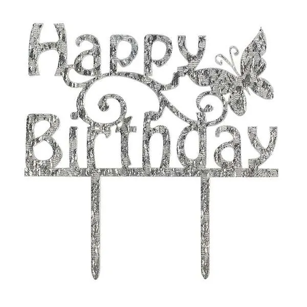 De Acryl Happy Birthday Cake Topper met een mooie zilveren glans is perfect voor op elke verjaardagstaart.