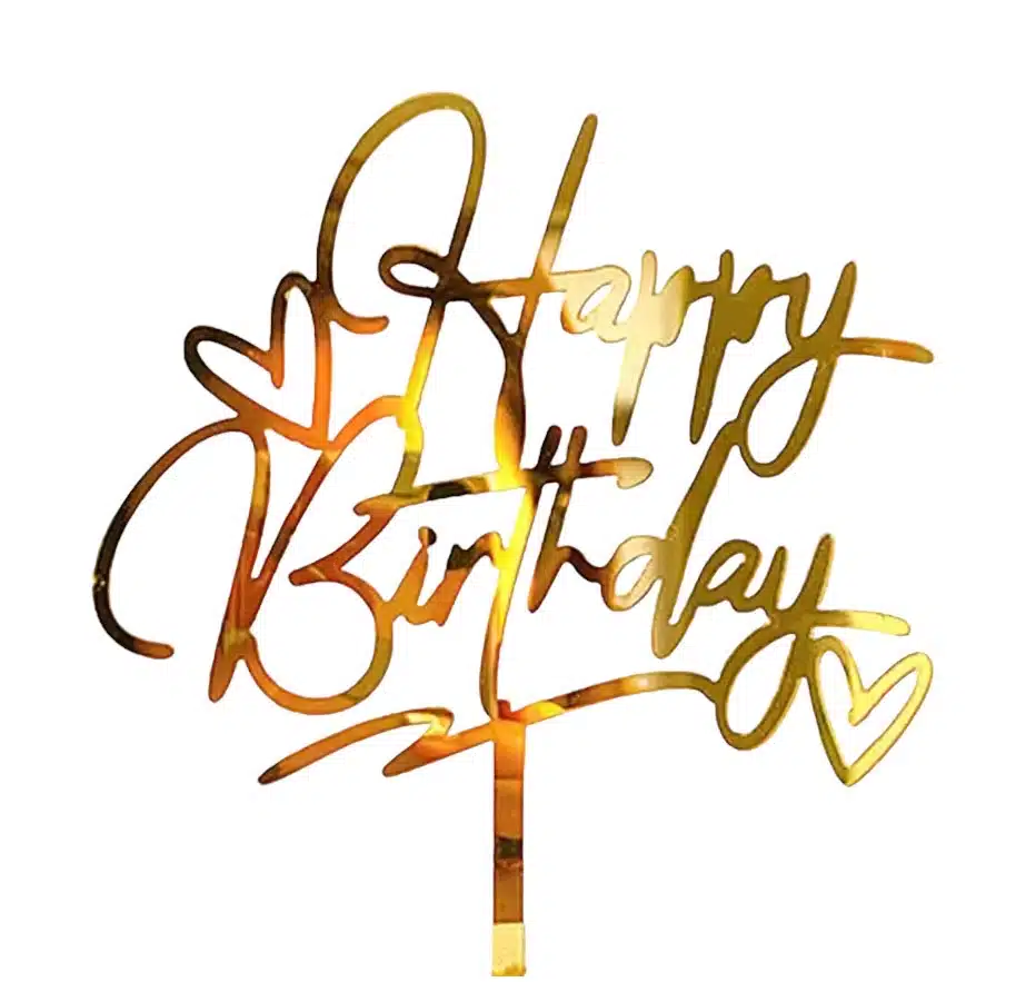 Leuke Happy Birthday topper van goud acryl met sierlijke letters en twee hartjes.