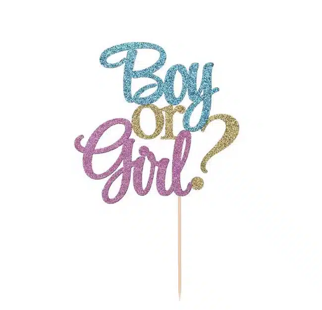 Leuke topper voor op een gender reveal of babyshower taart met de tekst Boy or Girl? in gekleurd stevig glitter papier