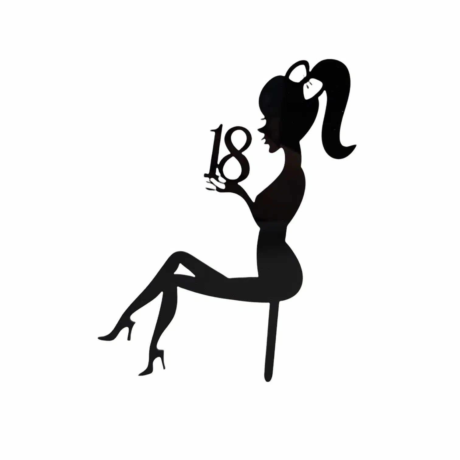 Leuke caketopper voor op een Sweet Sixteen verjaardagstaart van een jonge dame met hoge hakken en het getal 18 in haar hand. Van zwart acryl.