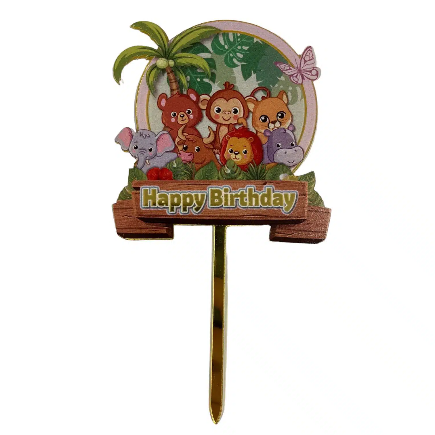 Schattige vorlijk gekleurde taarttopper van jungle diertjes en de tekst Happy Birthday.