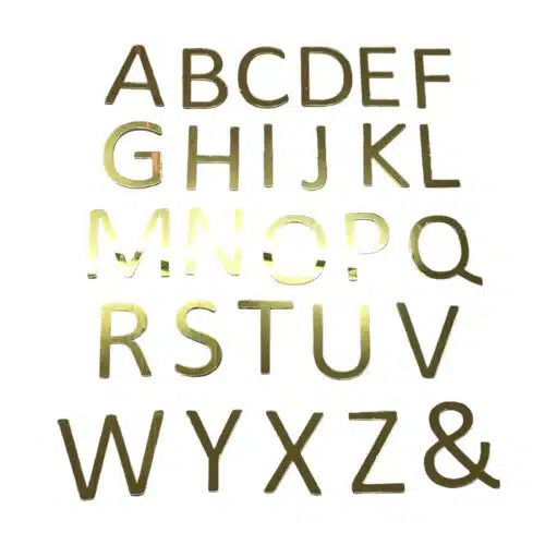 Mooie set van gouden strak smalle letters van Acryl voor het makkelijk aanbrengen van namen of initialen op taarten. De set bestaat uit 26 letters van A t/m Z en een &-teken.
