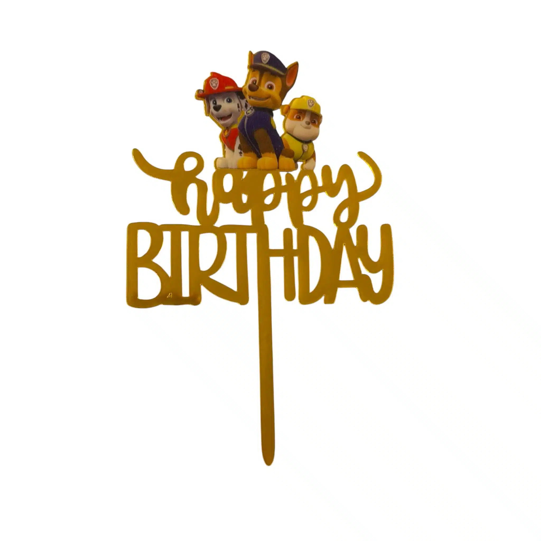 Voor de kleine Paw Patrol fans is deze Paw Patrol caketopper met Happy Birthday tekst in goud perfect voor op een mooie Paw Patrol taart.