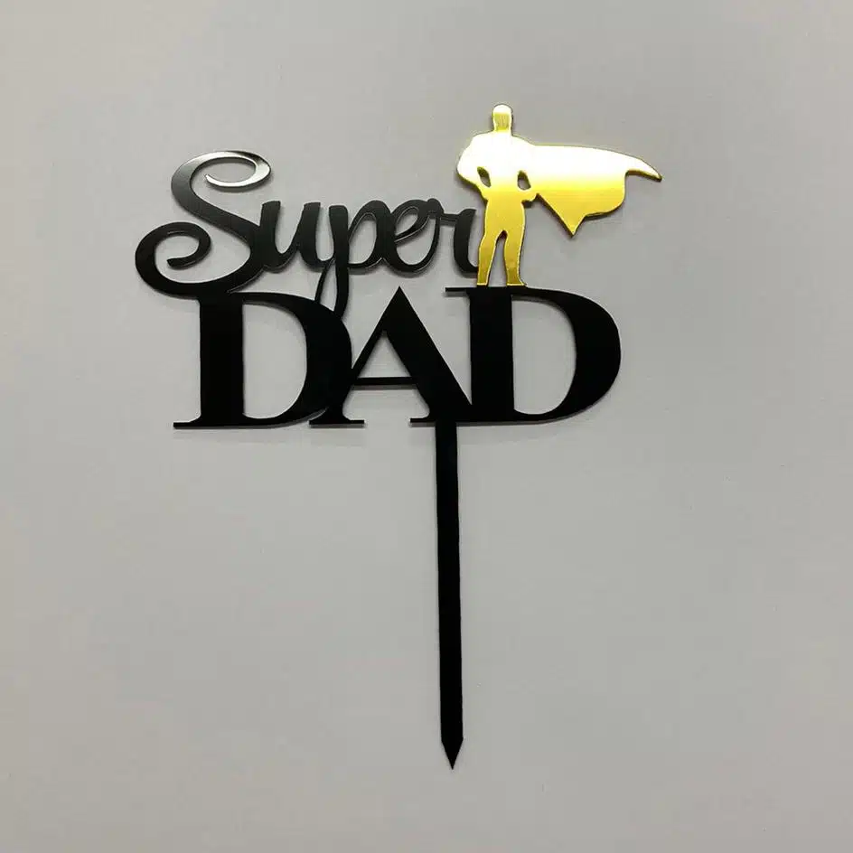 Speciaal voor al die lieve vaders voor op de vaderdag taart, deze stoere Super Dad taarttopper in zwart acryl met goud element.