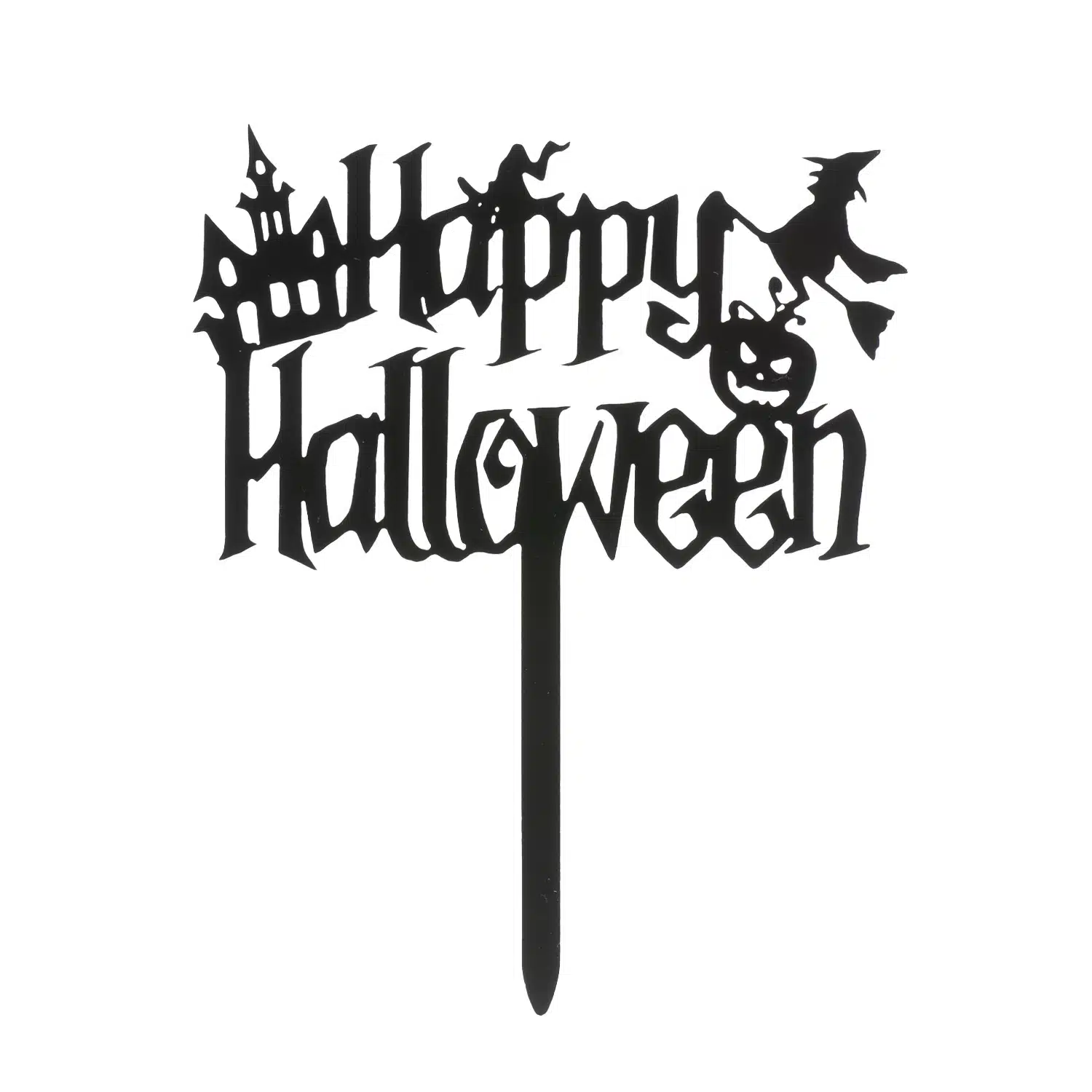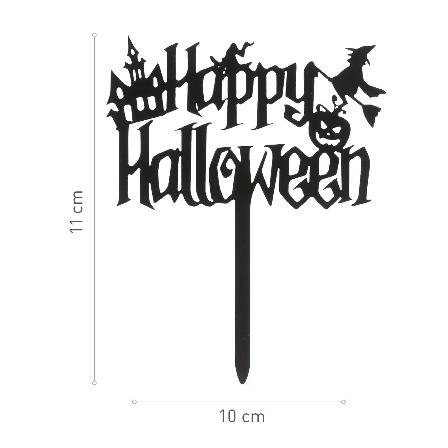 Sierlijke acryl zwarte taarttopper met de tekst Happy Halloween.