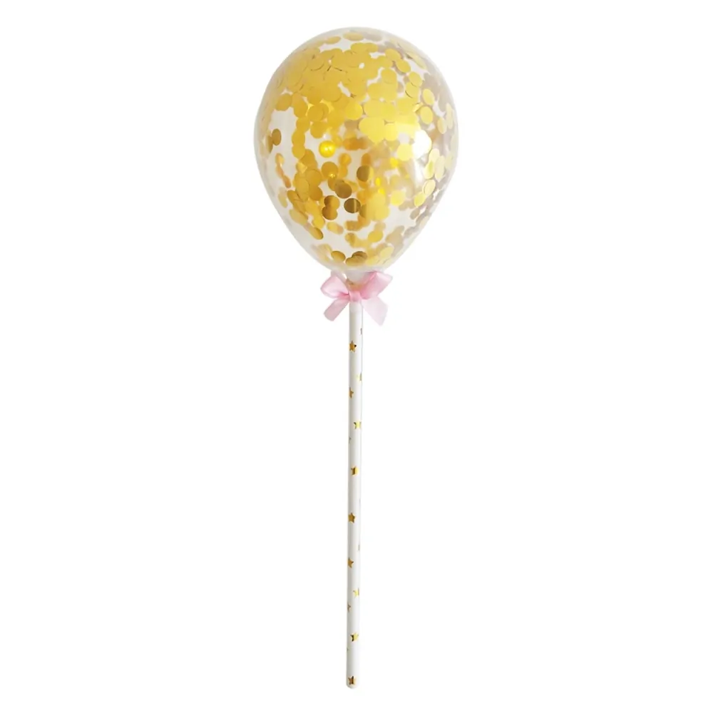 Helemaal hip deze confetti ballon caketoppers. Deze maken van elke taart een feestje. Super leuk ook op een drip cake! Inhoud: een ballon gevuld met confetti (in opgeblazen vorm ca 12 cm groot), een roze strikje, tape om het strikje te bevestigen aan het stokje (is dus optioneel), een plastic stokje (lengte 16 cm) om de ballon op vast te maken en een kartonnen stokje (wit met sterretjes, lengte 19,5 cm). Gebruiksaanwijzing: Je blaast de ballon met de confetti op en bindt deze vast. Vervolgens maak je de ballon statisch door deze tegen een shirt/trui/etc te wrijven. Draai de ballon rond, zodat de confetti rondom door de statische kracht aan de ballon blijft plakken. Bind de ballon vast aan de plastic houder. Je kan dan de plastic prikker rechtstreeks in de taart doen. Of je kan gebruik maken van de houder met de gouden sterretjes. Doe deze kartonnen houder in de taart en schuif daar vervolgens de plastic houder in. Optioneel: je kan daarna het strikje bevestigen met de bijgevoegde tape. Inhoud: 1 stuks met confetti in de kleur goud. Hier nog een instructiefilmpje: https://youtu.be/48J9z-1RjCc