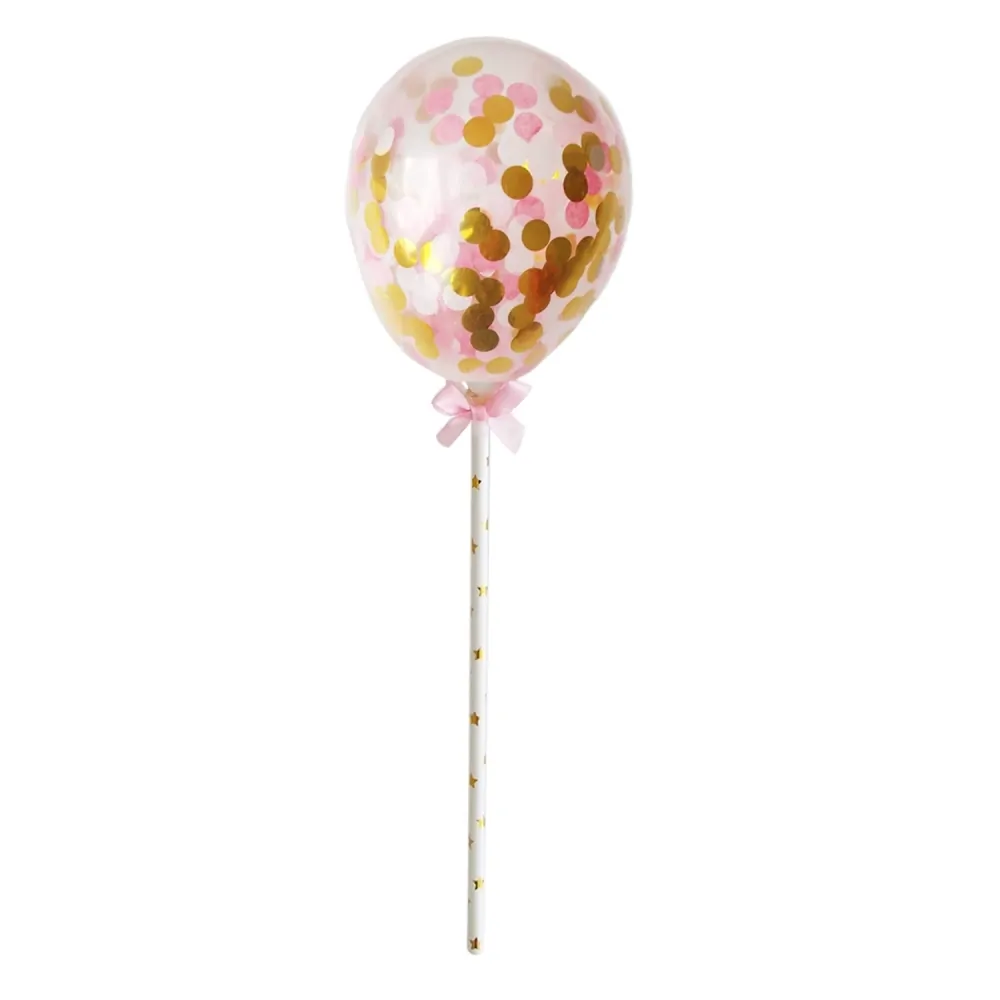 Helemaal hip deze confetti ballon caketoppers. Deze maken van elke taart een feestje. Super leuk ook op een drip cake! Inhoud: een ballon gevuld met confetti (in opgeblazen vorm ca 12 cm groot), een roze strikje, tape om het strikje te bevestigen aan het stokje (is dus optioneel), een plastic stokje (lengte 16 cm) om de ballon op vast te maken en een kartonnen stokje (wit met sterretjes, lengte 19,5 cm). Gebruiksaanwijzing: Je blaast de ballon met de confetti op en bindt deze vast. Vervolgens maak je de ballon statisch door deze tegen een shirt/trui/etc te wrijven. Draai de ballon rond, zodat de confetti rondom door de statische kracht aan de ballon blijft plakken. Bind de ballon vast aan de plastic houder. Je kan dan de plastic prikker rechtstreeks in de taart doen. Of je kan gebruik maken van de houder met de gouden sterretjes. Doe deze kartonnen houder in de taart en schuif daar vervolgens de plastic houder in. Optioneel: je kan daarna het strikje bevestigen met de bijgevoegde tape. Inhoud: 1 stuks met confetti in de tinten roze en goud. Hier nog een instructiefilmpje: https://youtu.be/48J9z-1RjCc