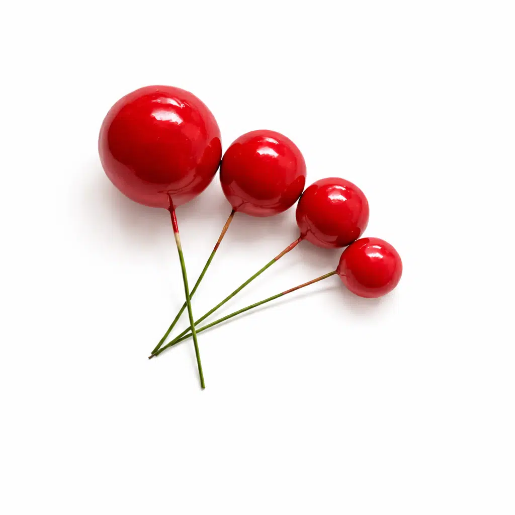 De bubbles zitten op ijzerdraad. Deze kan je wel rechtstreeks in een dummy taart steken, maar niet in een echte taart. Om de bubbles in een echte taart te steken, gebruik je een flowerpick, een rietje of je bindt de ijzerdraad goed in verschoudfolie. Het ijzerdraad mag niet in contact komen met de taart. De bubbles zelf mogen wel in contact komen met de taart.