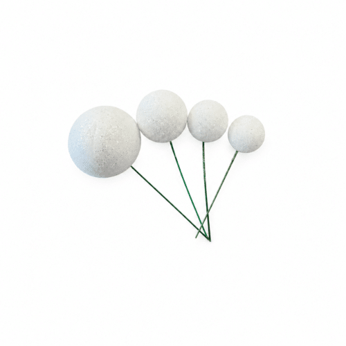 De bubbles zitten op ijzerdraad. Deze kan je wel rechtstreeks in een dummy taart steken, maar niet in een echte taart. Om de bubbles in een echte taart te steken, gebruik je een flowerpick, een rietje of je bindt de ijzerdraad goed in verschoudfolie. Het ijzerdraad mag niet in contact komen met de taart. De bubbles zelf mogen wel in contact komen met de taart.