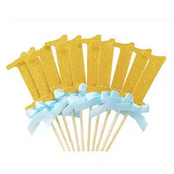 Schattige cupcake prikkers met het cijfer 1 in het goud en een blauw strikje.