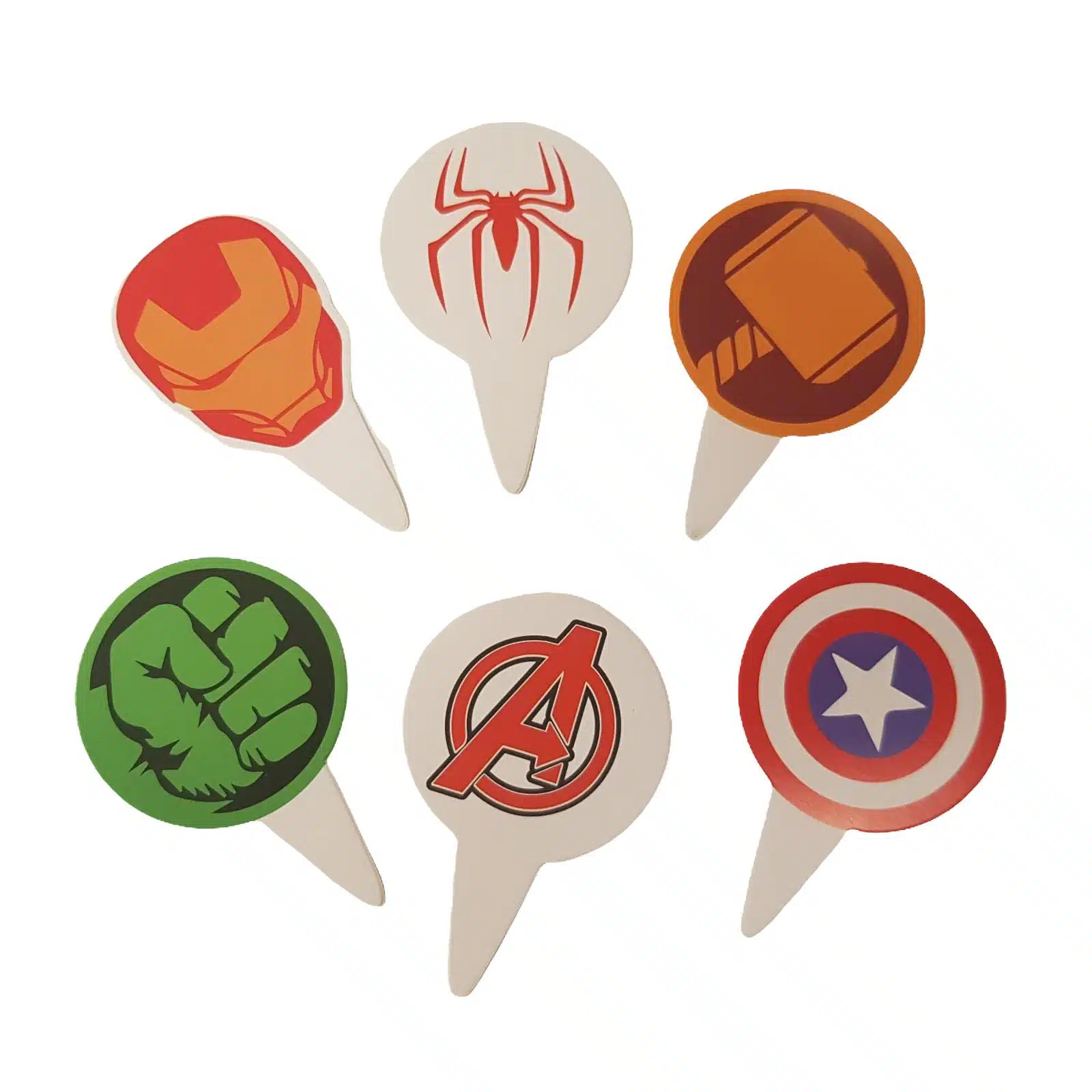 Voor iedere Avengers fan deze leuke cupcakeprikkers met afbeeldingen van de hamer van Thor, de vuist van de Hulk, Iron Man masker, Captain America schild, Spiderman spin en Avengers logo.