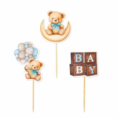 Schattige cupcake prikkers voor het vieren de geboorte van een jongen! De prikkers zijn van stevig papier. De set van 12 prikkers bevat 3 verschillende prikkers met de afbeeldingen van een beertje op de maan, een beertje met balonnen en baby blokken met bruin en blauw tinten.