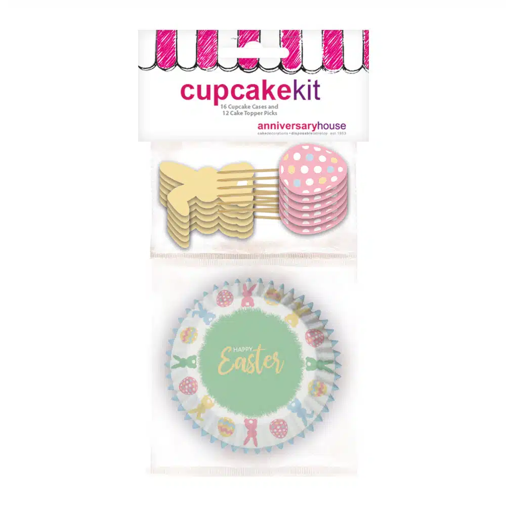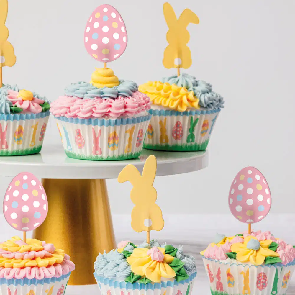 Schattige set van cupcake bakjes en snoezifge cupcake prikkers in pastel tintjes. Maak van jouw Paas cupcakes een mooi feestje!