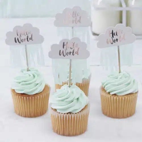 Schattige cupcake prikkers met de tekst ‘Hello World’ in een wolkje met onder het wolkje licht blauwe papiersnippers.