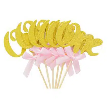 Schattige cupcake prikkers met de tekst One in het goud en een roze strikje.