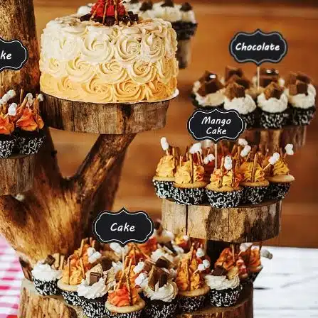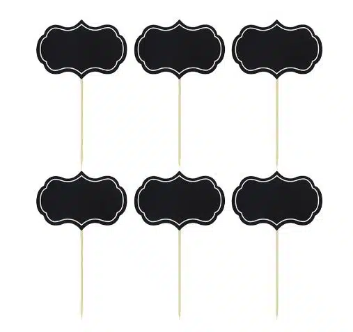 Leuke grote ‘krijtbord’ prikkers voor een Sweet Table. De prikkers zijn van zwart karton. Met een witte verfstift kan je teksten op de bordjes schrijven.