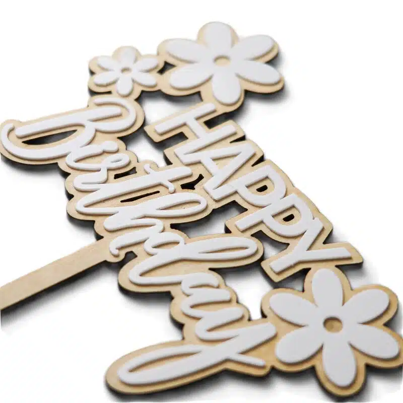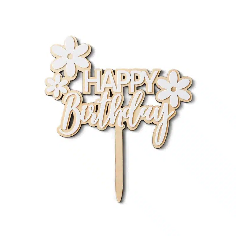 Mooie taarttopper van hout en opgelegd wit/beige acryl met de tekst Happy Birthday met vrolijke bloemen.