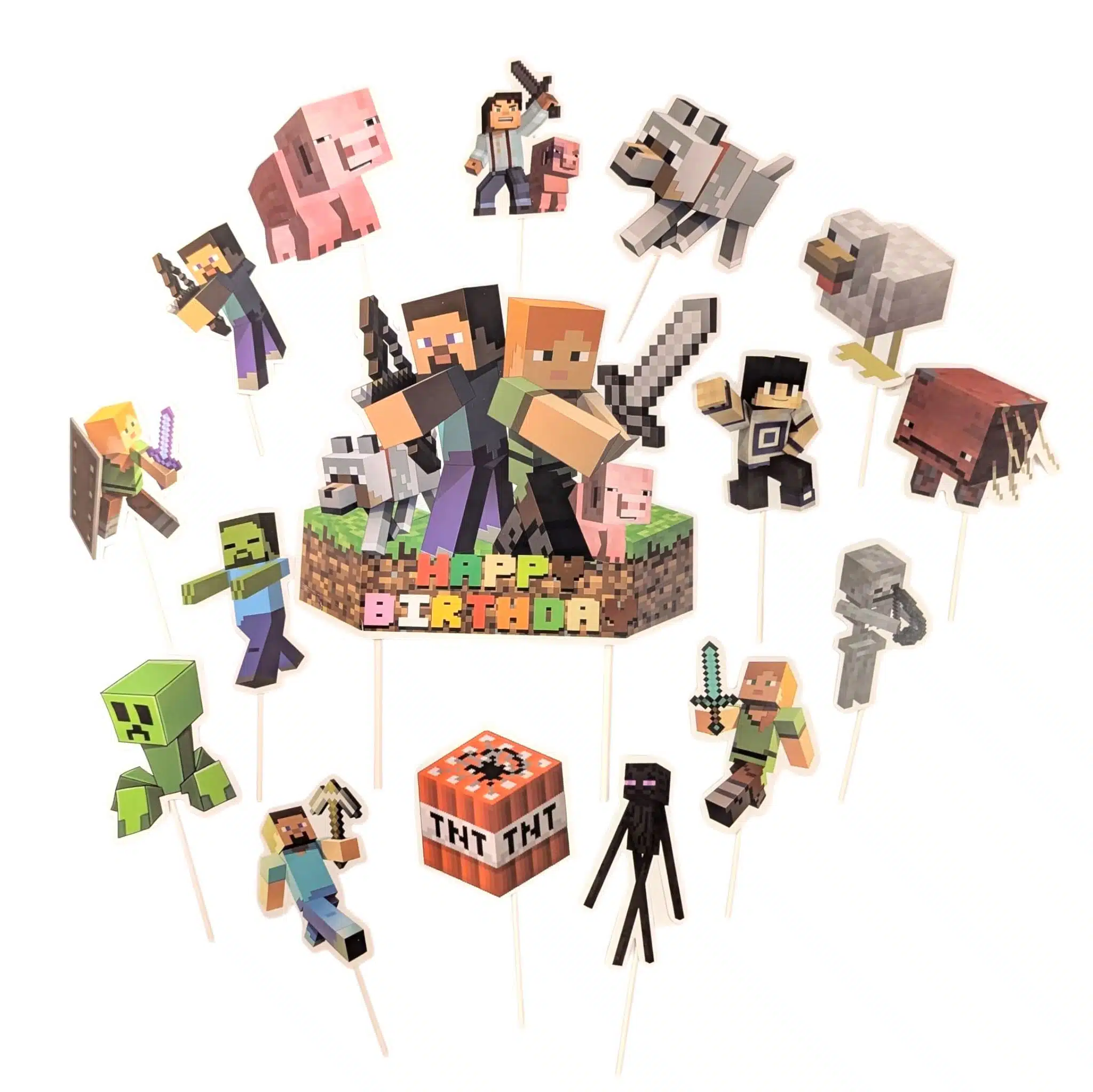 Leuke taarttopper van Minecraft met 15 cupcake prikkers voor iedere Minecraft fan!