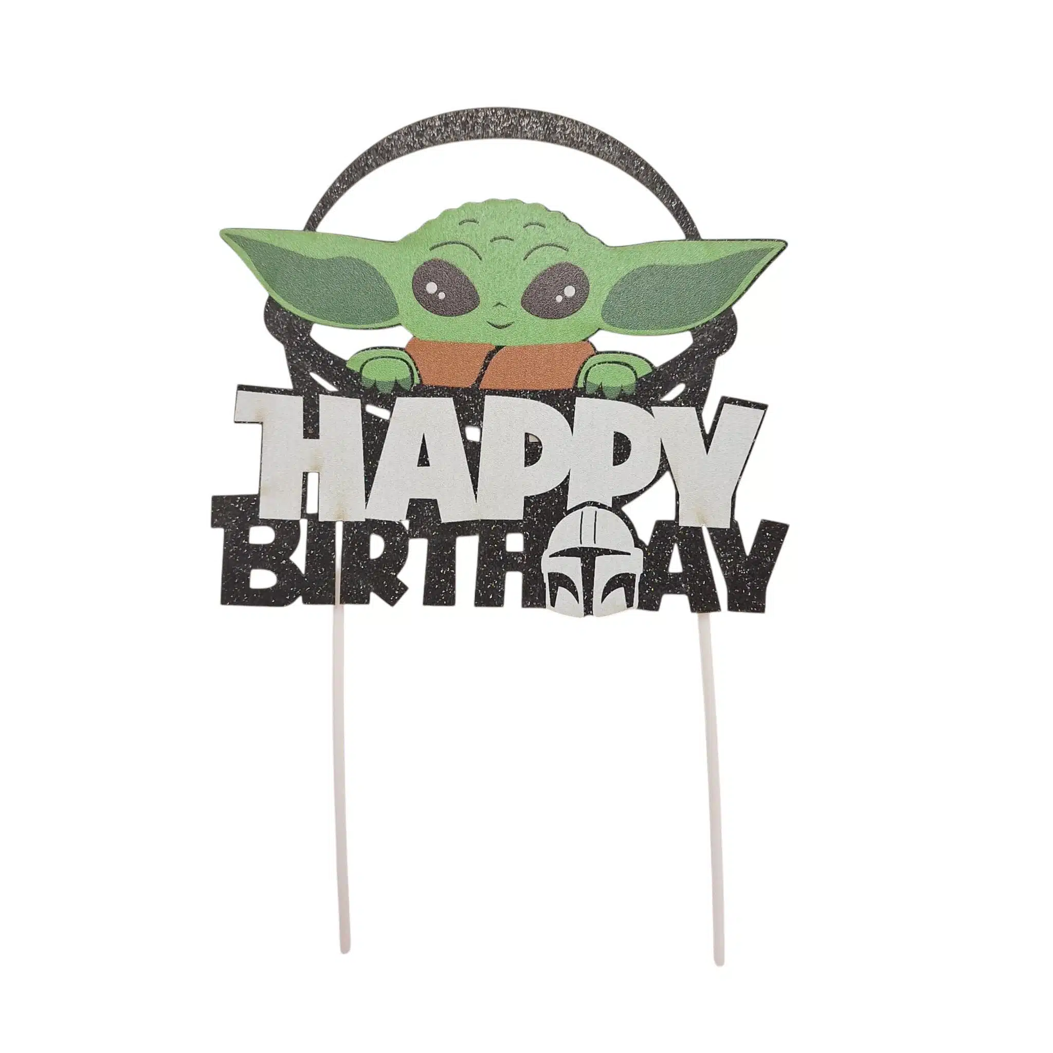 Mooie caketopper van baby Yoda met de tekst Happy Birthday.