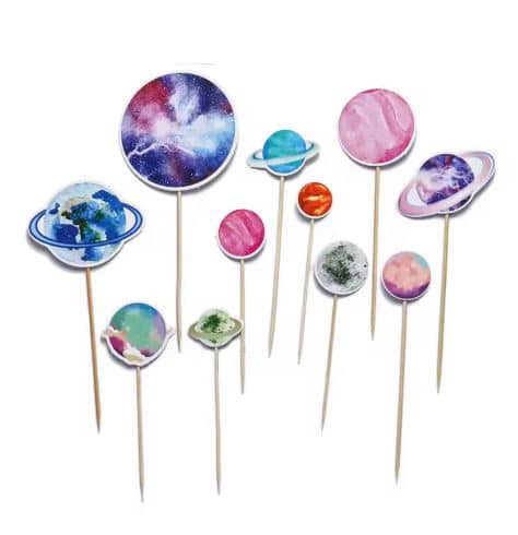 Leuke taartdecoratie set ven verschillende planeten van stevig mooi gekleurd papier. In het pakket zitten 11 afbeeldingen waarmee je jouw taart in een handomdraai kan omtoveren tot een mooie Galaxy taart! Ook geschikt voor op cupcakes.