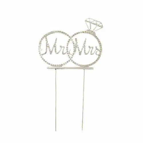 Mooie taarttopper voor een bruidstaart met Mr&Mrs in twee ringen met strass steentjes.