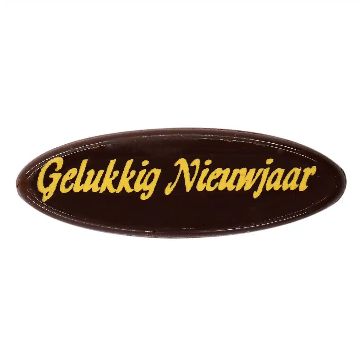 Vier het nieuwe jaar met de Callebaut Chocoladedecoratie met de tekst Gelukkig Nieuwjaar. Deze versiersels zijn vervaardigd uit de lekkerste donkere chocolade. Elk chocolaatje heeft een ovale vorm en heeft de tekst Gelukkig Nieuwjaar.