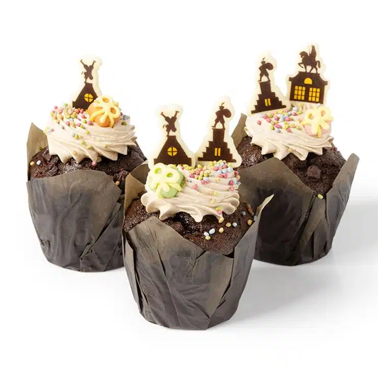 Leuke Sinterklaas Cupcake prikkers gemaakt van de heerlijkste belgische chocolade. Maak van jouw Sinterklaas cupcakes een waar feestje!
