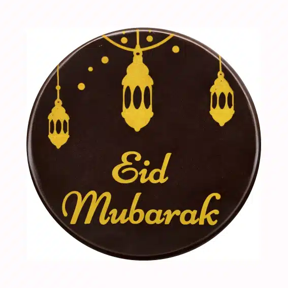 De Chocoladedecoratie Eid Mubarak rond is een prachtige decoratie van pure chocolade met de tekst Eid Mubarak erop. Het chocolaatje heeft een ronde vorm van 3,5 cm doorsnede. Deze chocoladedecoratie is perfect om cupcakes, taarten en gebakjes mee af te werken. De kant-en-klare decoraties zijn vooral ideaal om het Suikerfeest te vieren. De verpakking bevat 12 chocolaatjes.