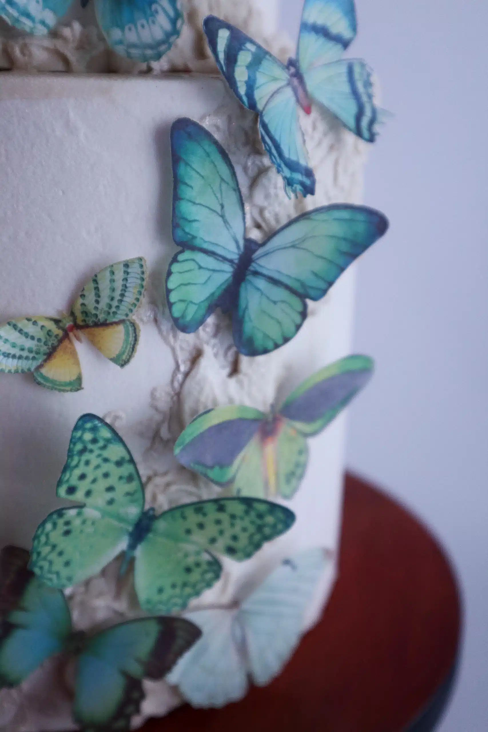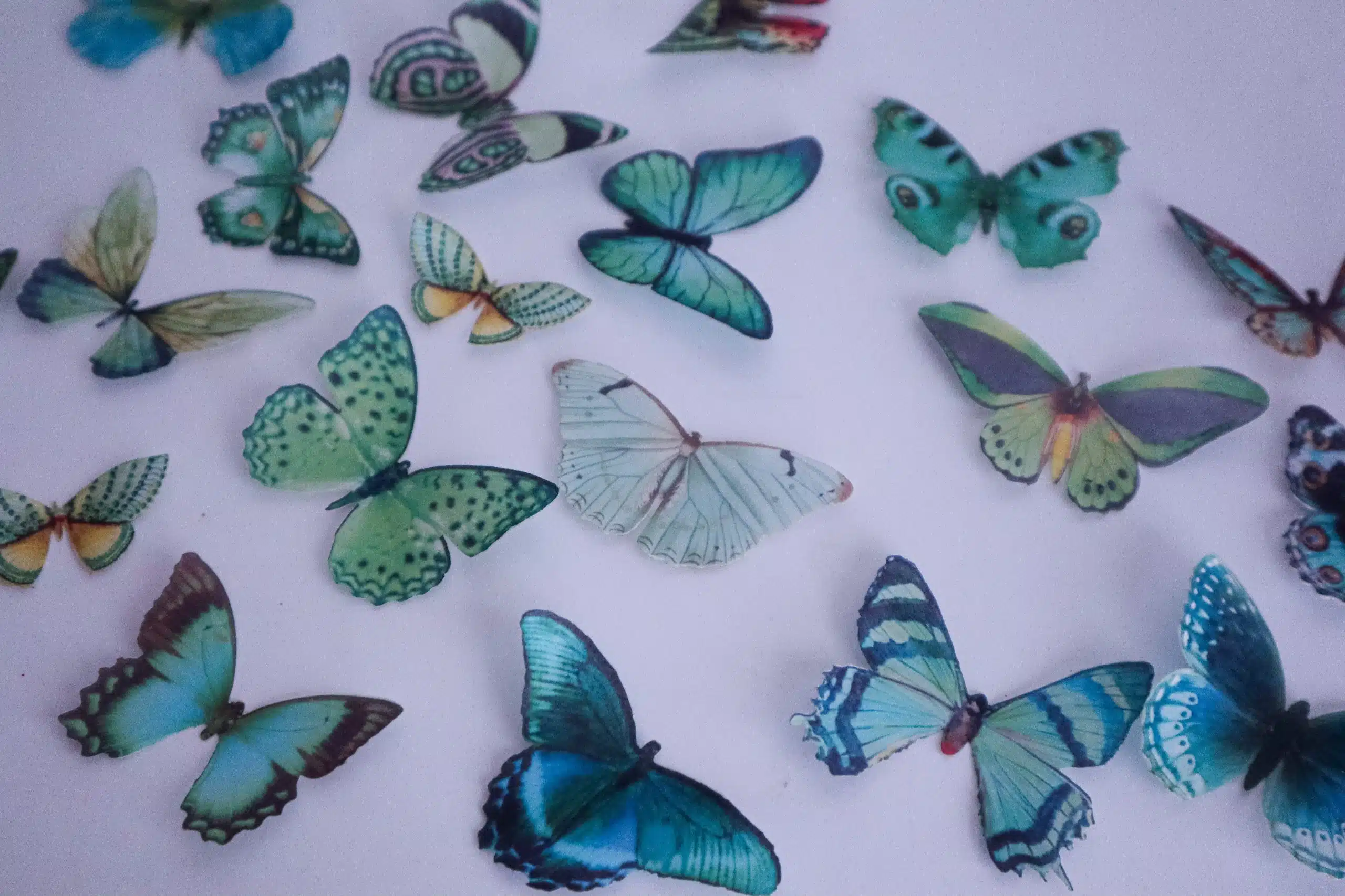 Prachtige ouwel vlinders van stevig ouwel papier bedrukt met in een blauw/groene print in meerdere soorten. De vlinders zijn reeds uitgestanst, dus je hoeft ze niet meer uit te knippen. Ideaal om jouw (bruids)taarten mee te decoreren.