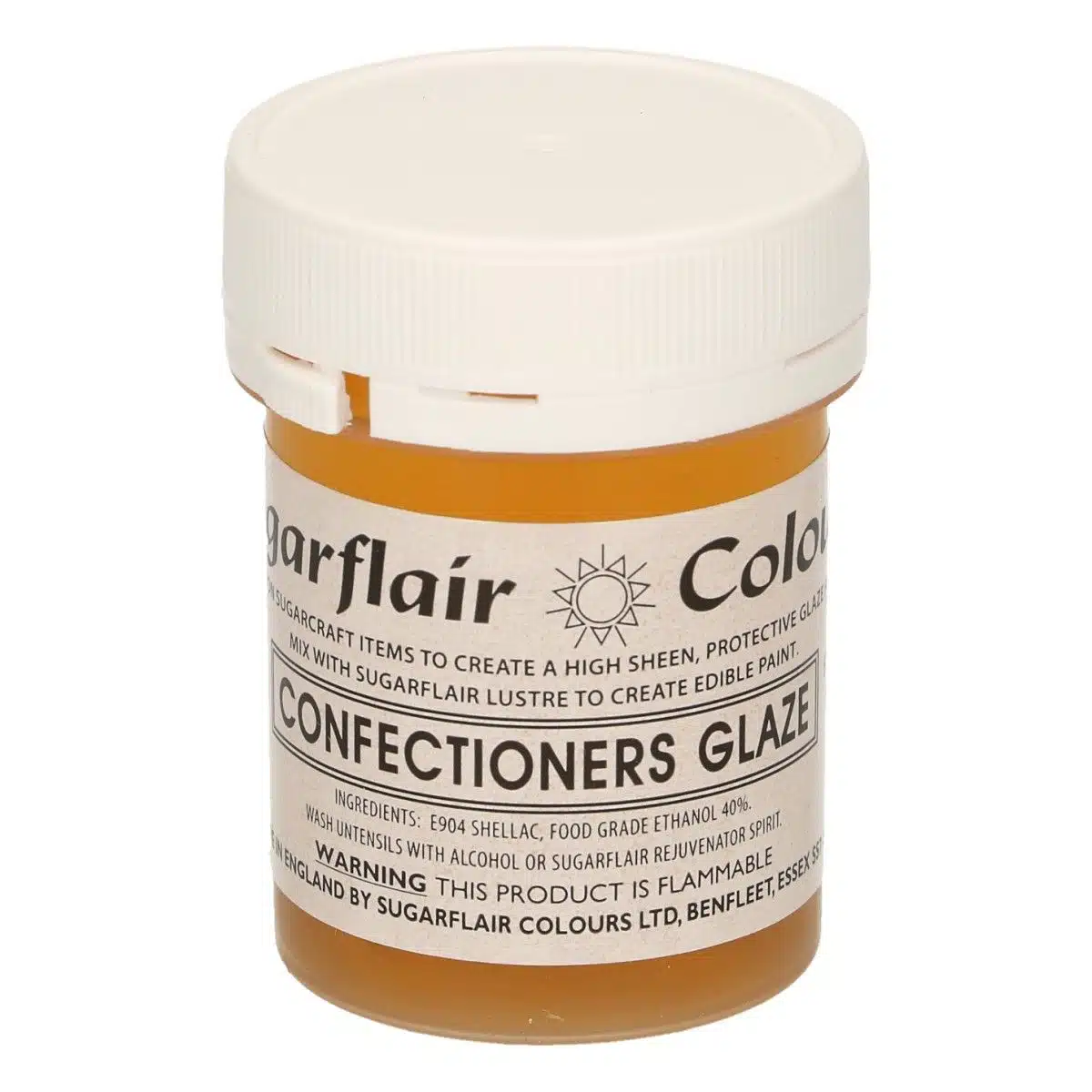 De Sugarflair Confectioners Glaze is het perfecte product om je suikerwerk, chocolade en marsepein een hoogglans afwerking te geven. Je kunt de glaze ook mixen met de Sugarflair lustre om eetbare verf te maken.