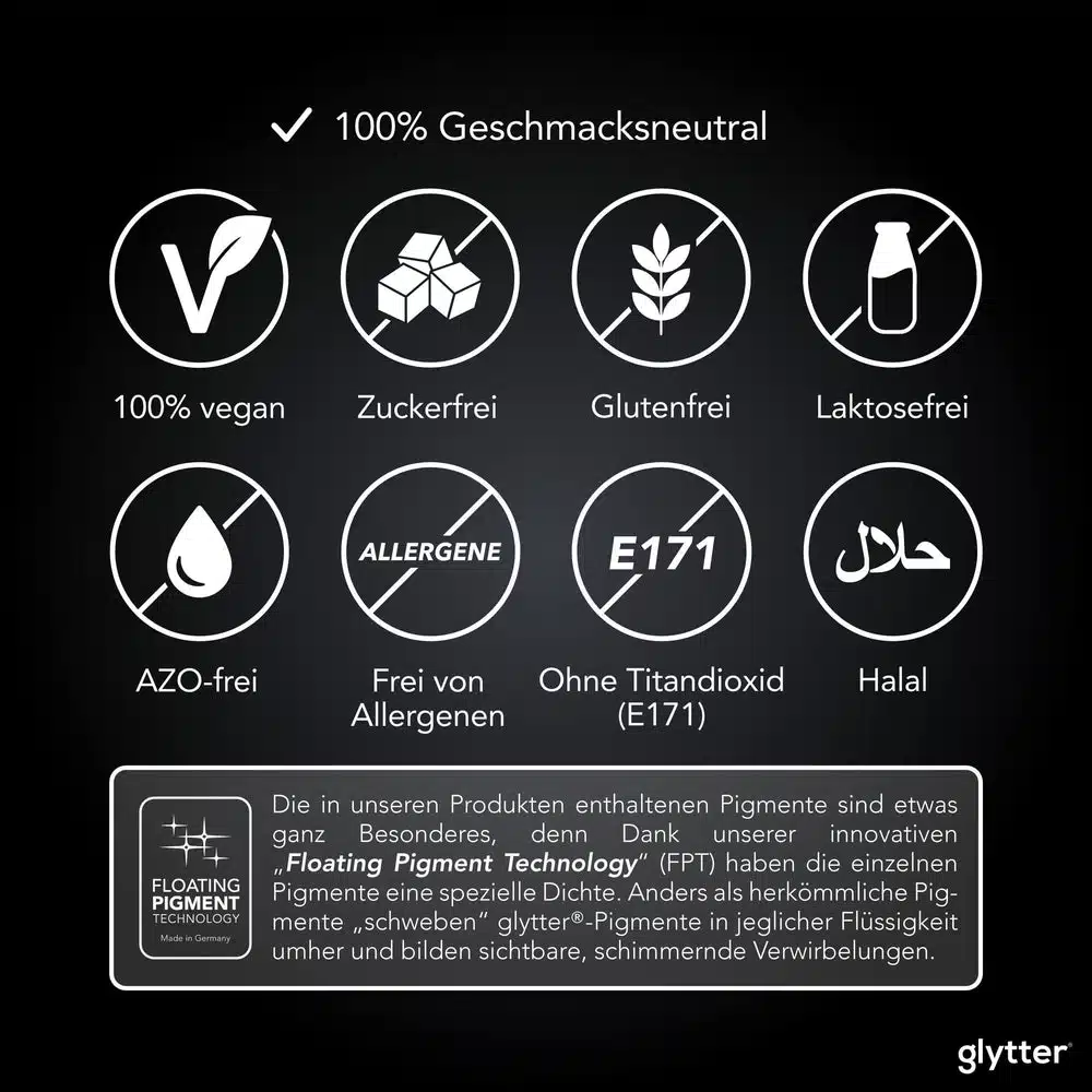 Glytter® is AZO-vrij, lactosevrij, alcoholvrij en suikervrij.
