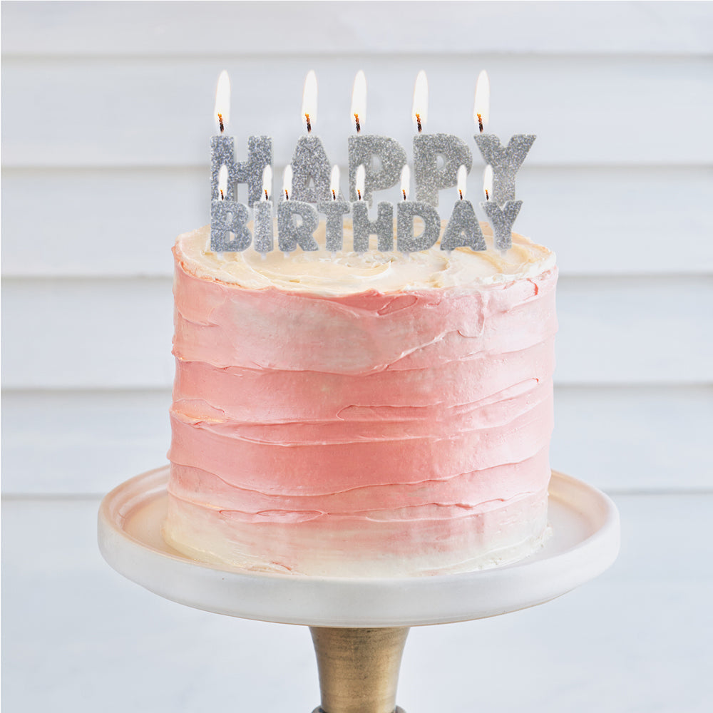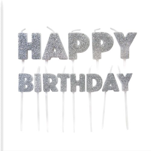Mooie zilveren glitterende kaarsjes in de tekst Happy Birthday. Hiermee maak je van iedere taart een feestje!