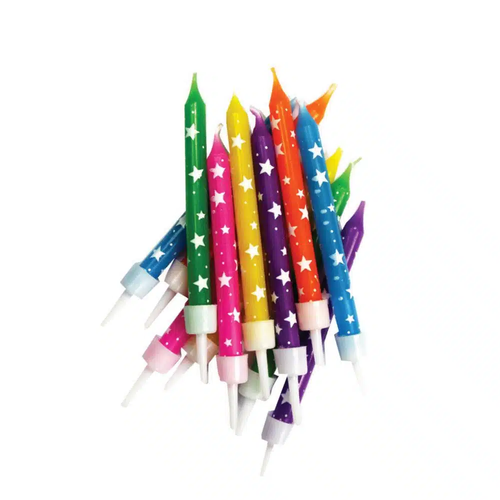 Mooie kaarsjes mix in verschillende kleuren met sterren! Inclusief houders.