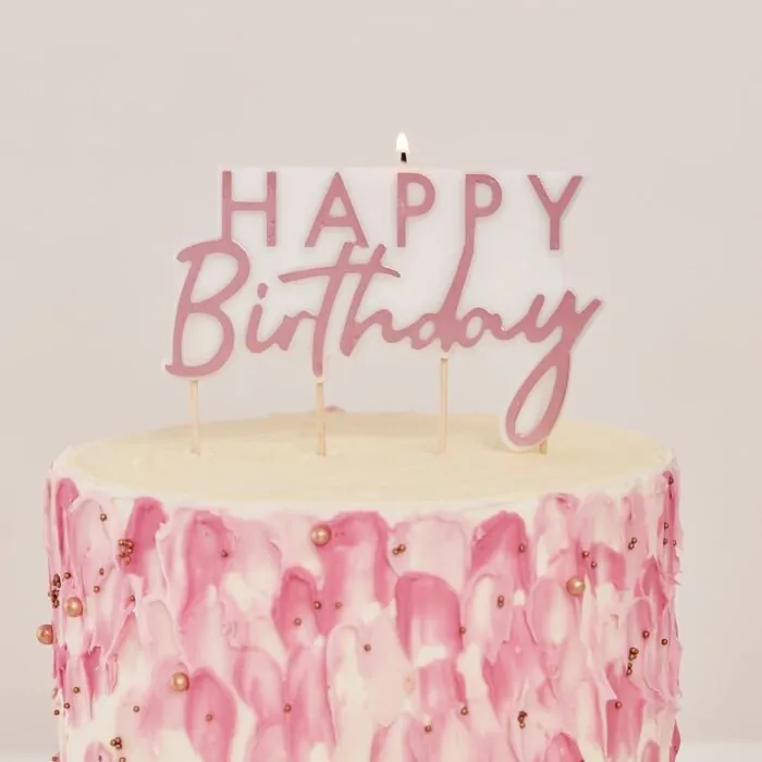 Mooie Happy Birthday kaars in rosé gouden letters.