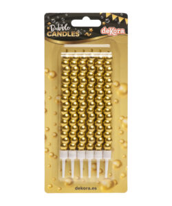 Geef jouw taart een luxe en trendy uitstraling met deze gouden bubbelkaarsen van Dekora. De kaarsen hebben een unieke vorm waarbij kleine gouden bubbels speels op elkaar lijken gestapeld. Dit zorgt voor een stijlvol 3D-effect dat direct opvalt en perfect past bij moderne en feestelijke taartdecoratie.
