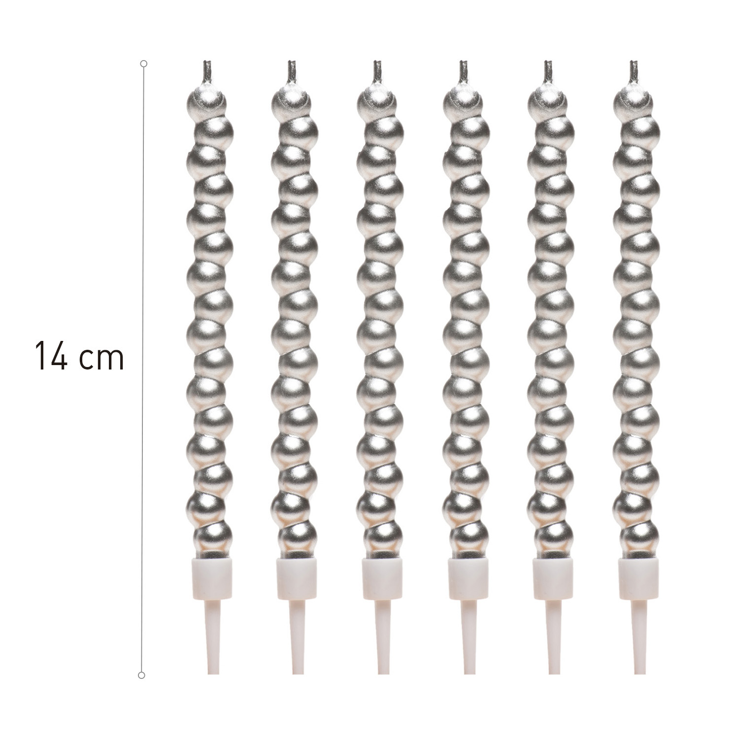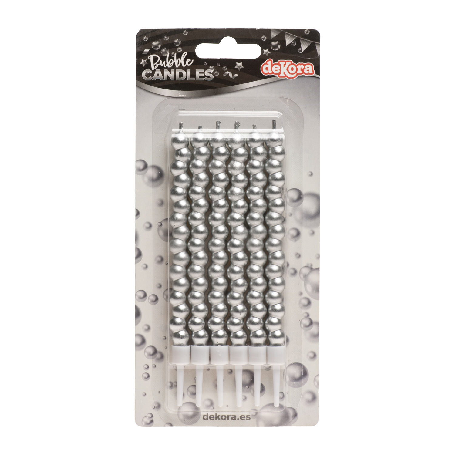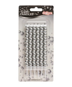 Geef jouw taart een luxe en trendy uitstraling met deze zilveren bubbelkaarsen van Dekora. De kaarsen hebben een unieke vorm waarbij kleine zilveren bubbels speels op elkaar lijken gestapeld. Dit zorgt voor een stijlvol 3D-effect dat direct opvalt en perfect past bij moderne en feestelijke taartdecoratie.