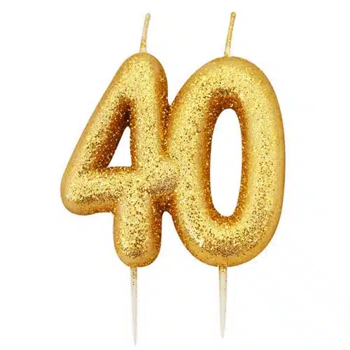 Nummerkaars in de vorm van het cijfer 40 van glitter goud. De kaars heeft een hoogte van 7cm.