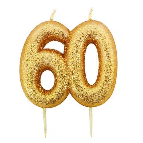 Nummerkaars in de vorm van het cijfer 60 van glitter goud. De kaars heeft een hoogte van 7cm.