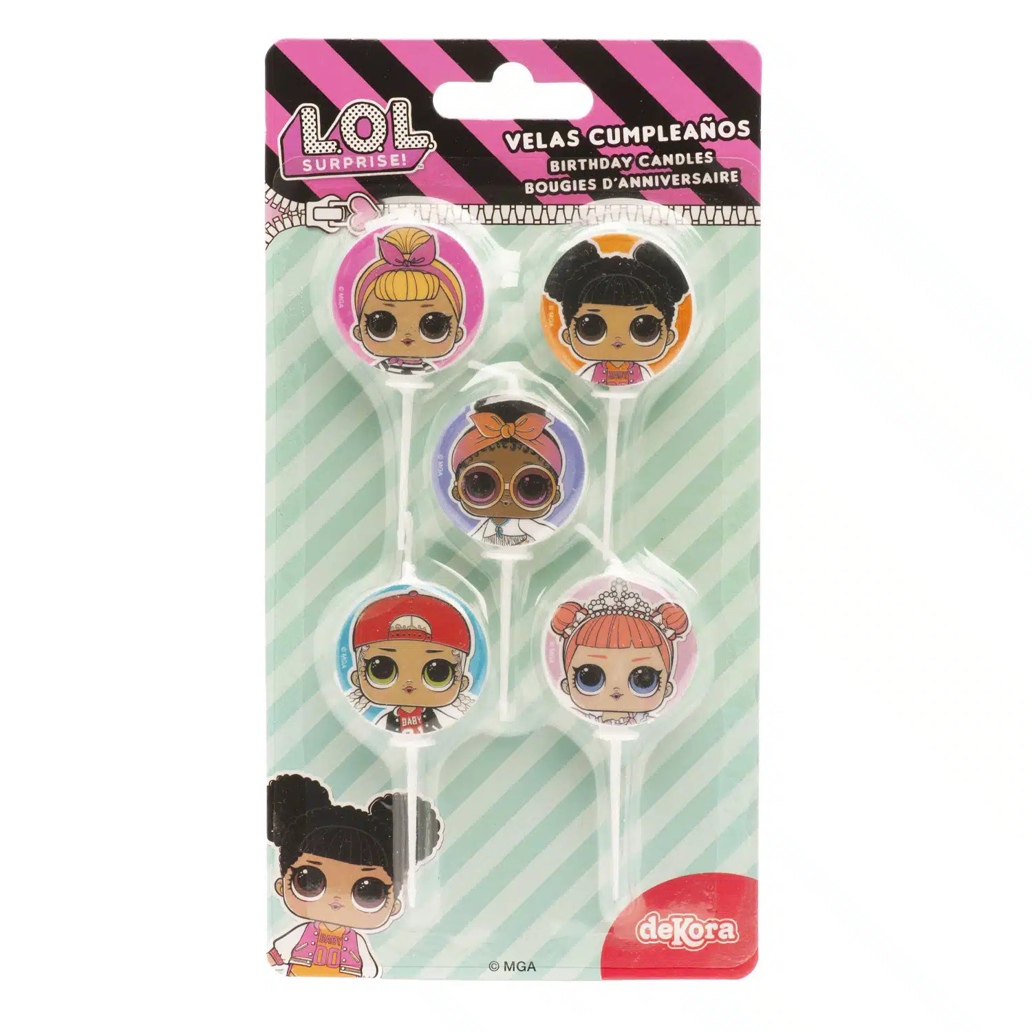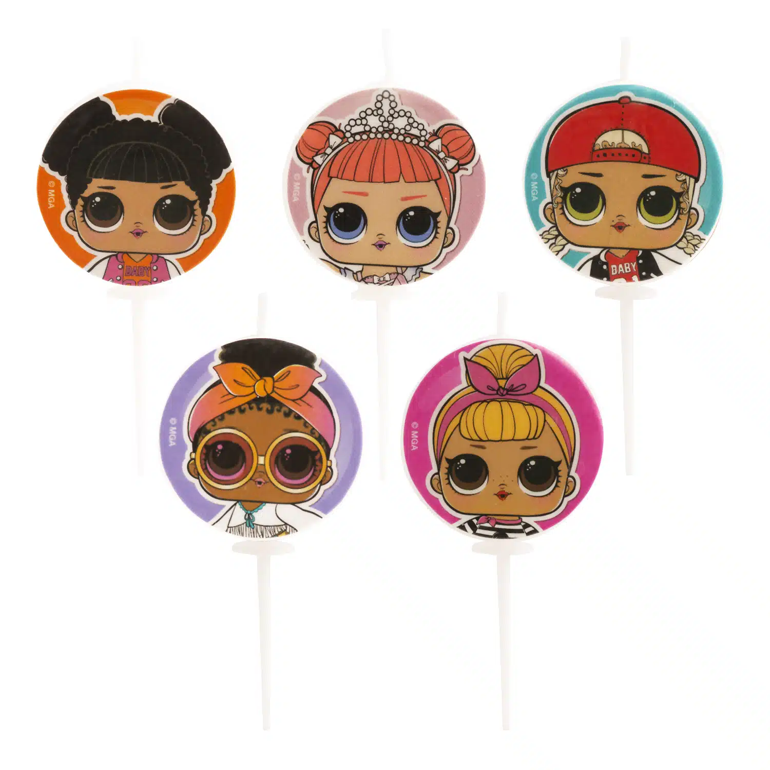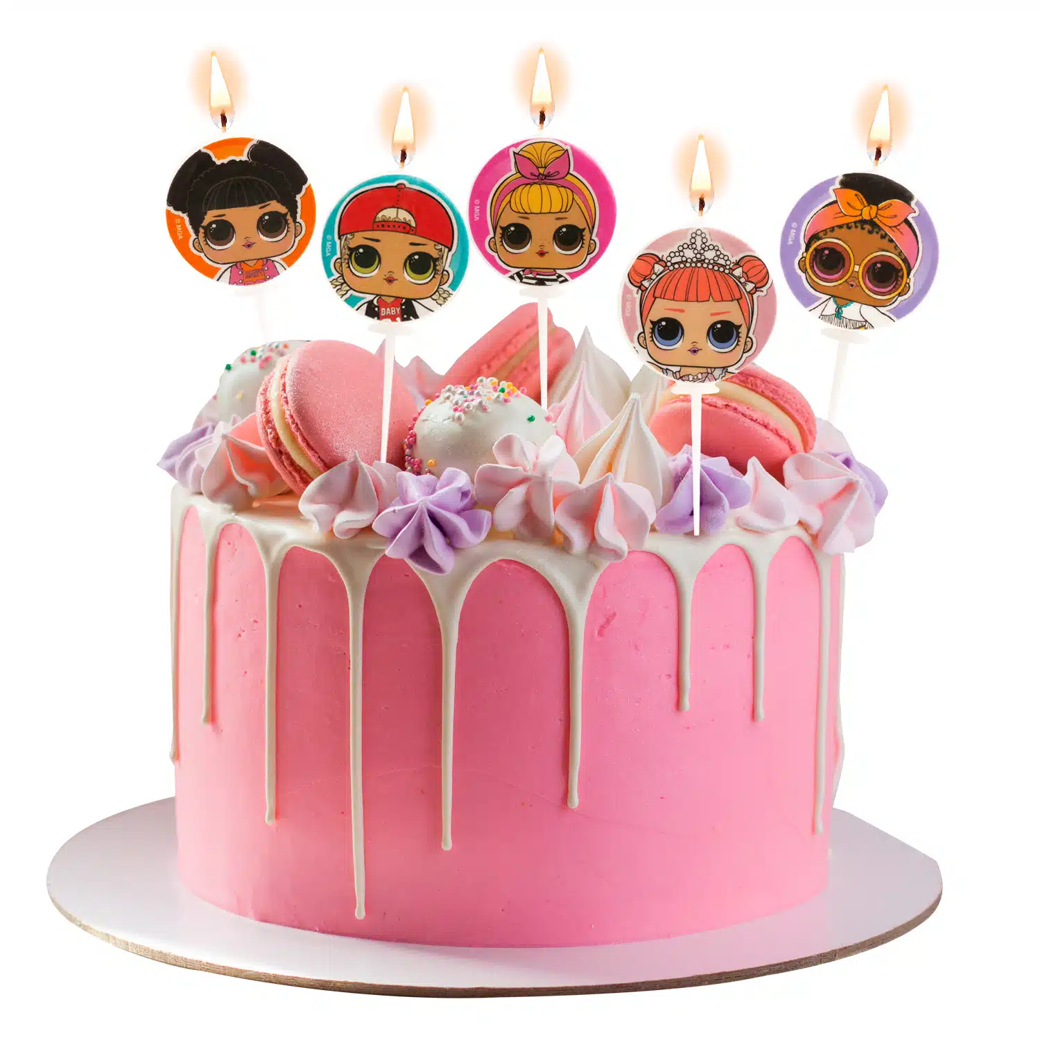 Leuke ronde kaarsjes op een prikker voor op een taart of op cupcakes met verschillende LOL Surprise afbeeldingen.