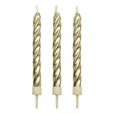 Deze PME Gouden Twist Kaarsen zijn perfect om elke feesttaart mee af te maken. De verpakking bevat 10 Gouden Kaarsen en 10 witte plastic houders.